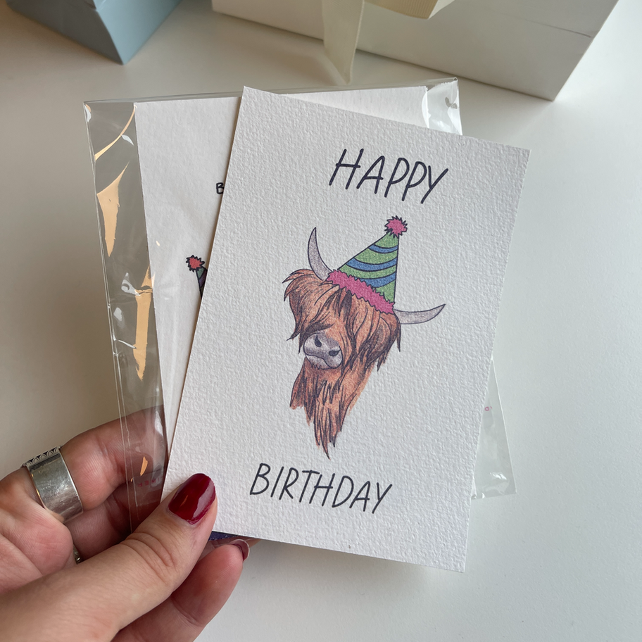 Bursdagskort i A6 format som er håndtegnet designet og trykt her på Studio.